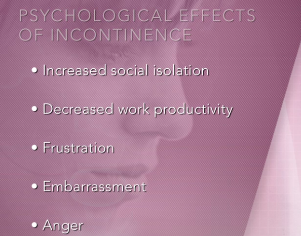 The psychological effects of urinary incontinence can be equally as damaging. Frustration and embarrassment can lead to increased social isolation, decreased work productivity and an overall effect on mood commonly causing anger or depression.